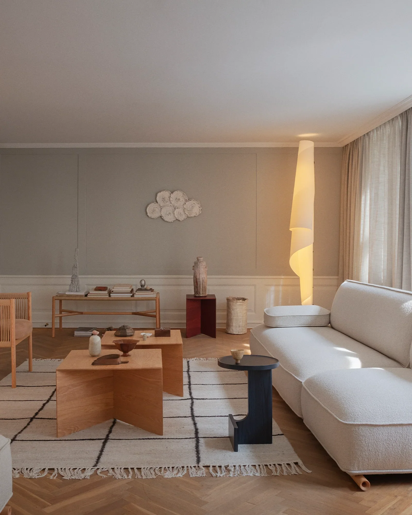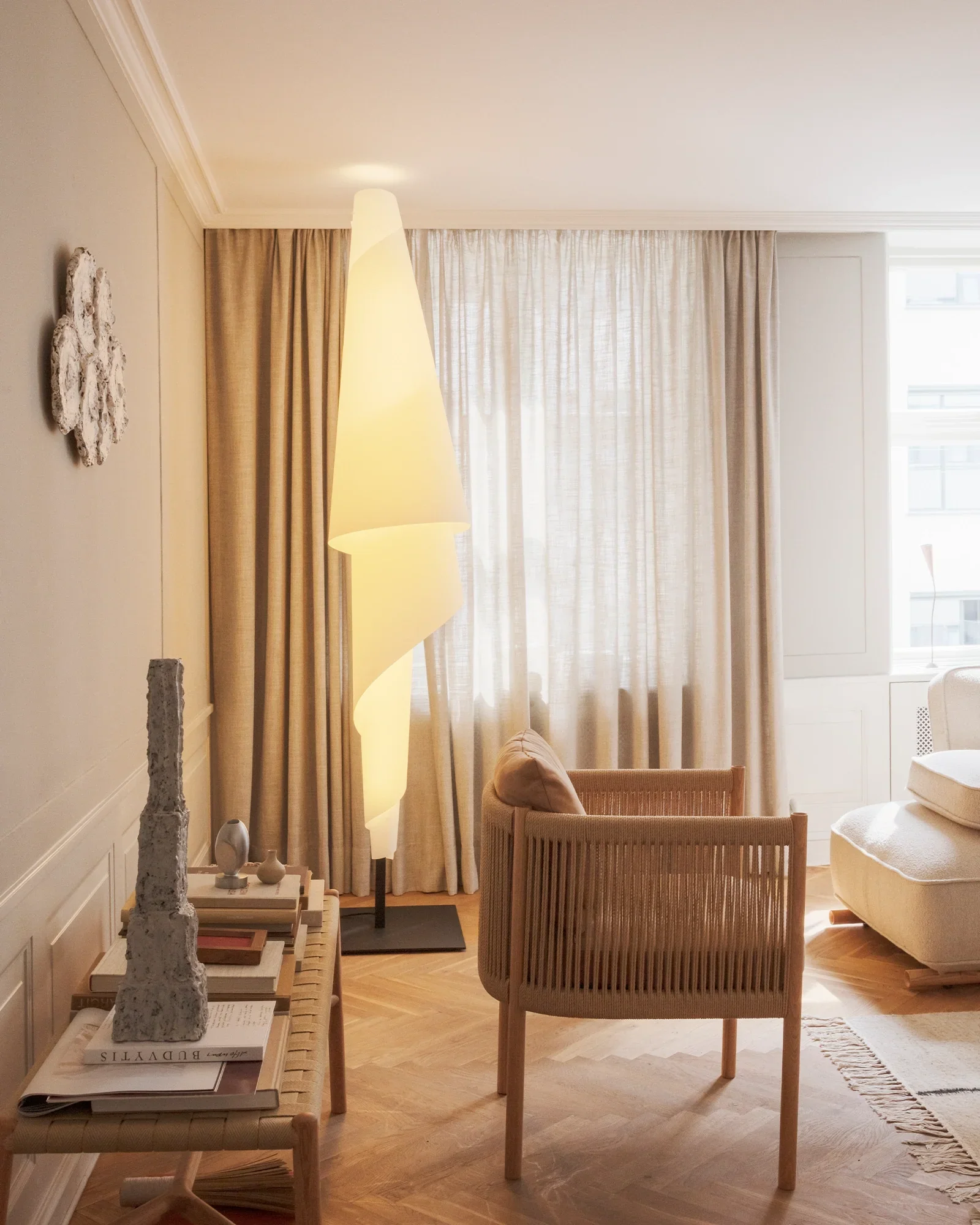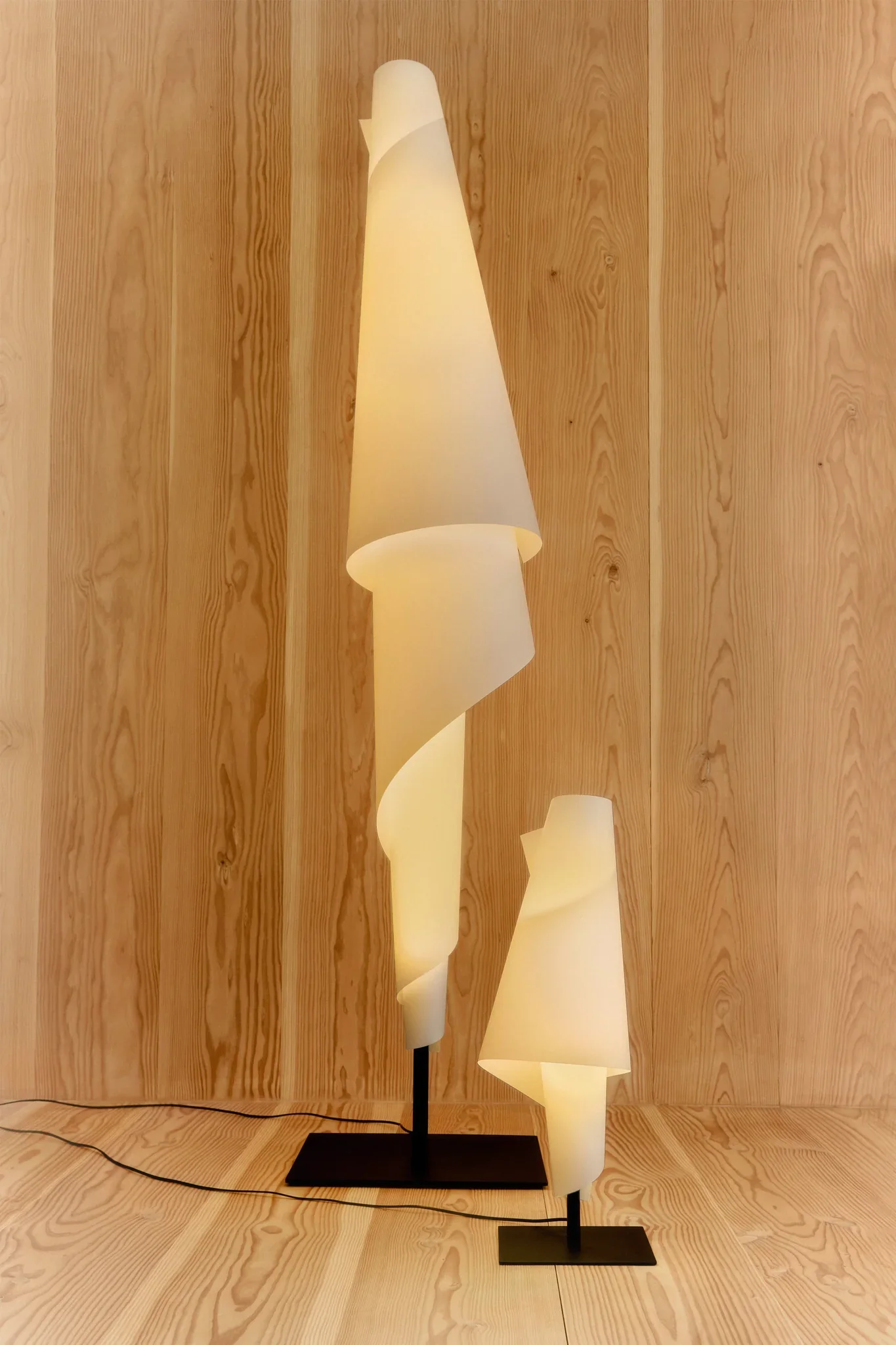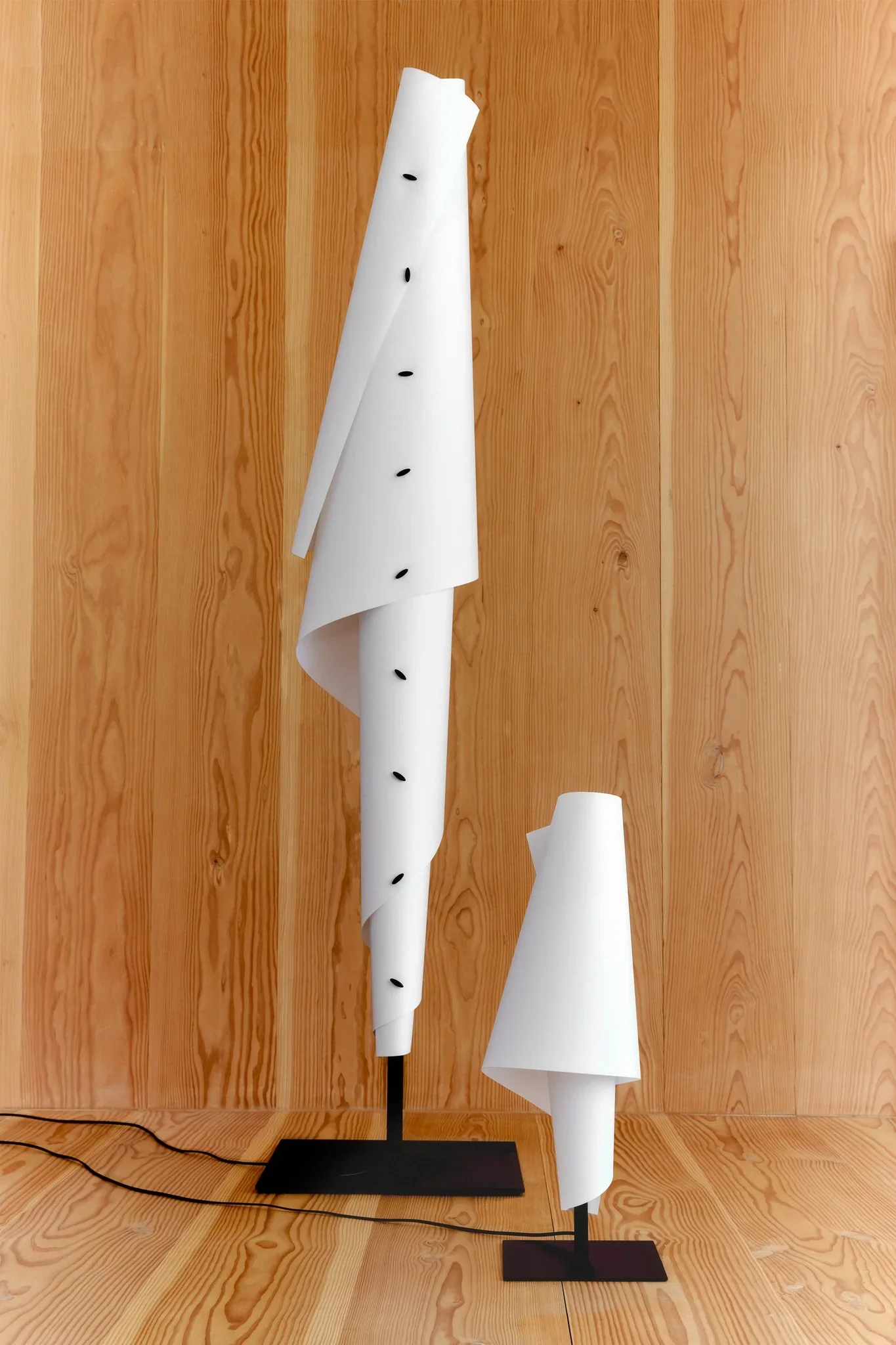 Designed by Josep Aregall in 1992 during the Barcelona Olympic Games, the Alta Costura and Costura floor lamps exemplify timeless elegance through simplicity. Each lamp features a translucent PVC paper diffuser that wraps around a textured black steel mast, creating a textile-like appearance that recalls haute couture tailoring. The diffuser maintains its sculptural form through custom buttons gently fastened at the back, mimicking the meticulous work of a tailor. This unique construction process engages the user in the artistry of assembly. The light source provides warm, soothing, textured illumination perfect for living rooms, bedrooms, and study areas. Available in two heights, these iconic floor lamps have endured for over three decades through their elegant, unrepeatable design. Made in Spain, they represent the marriage of functional lighting and sculptural presence.