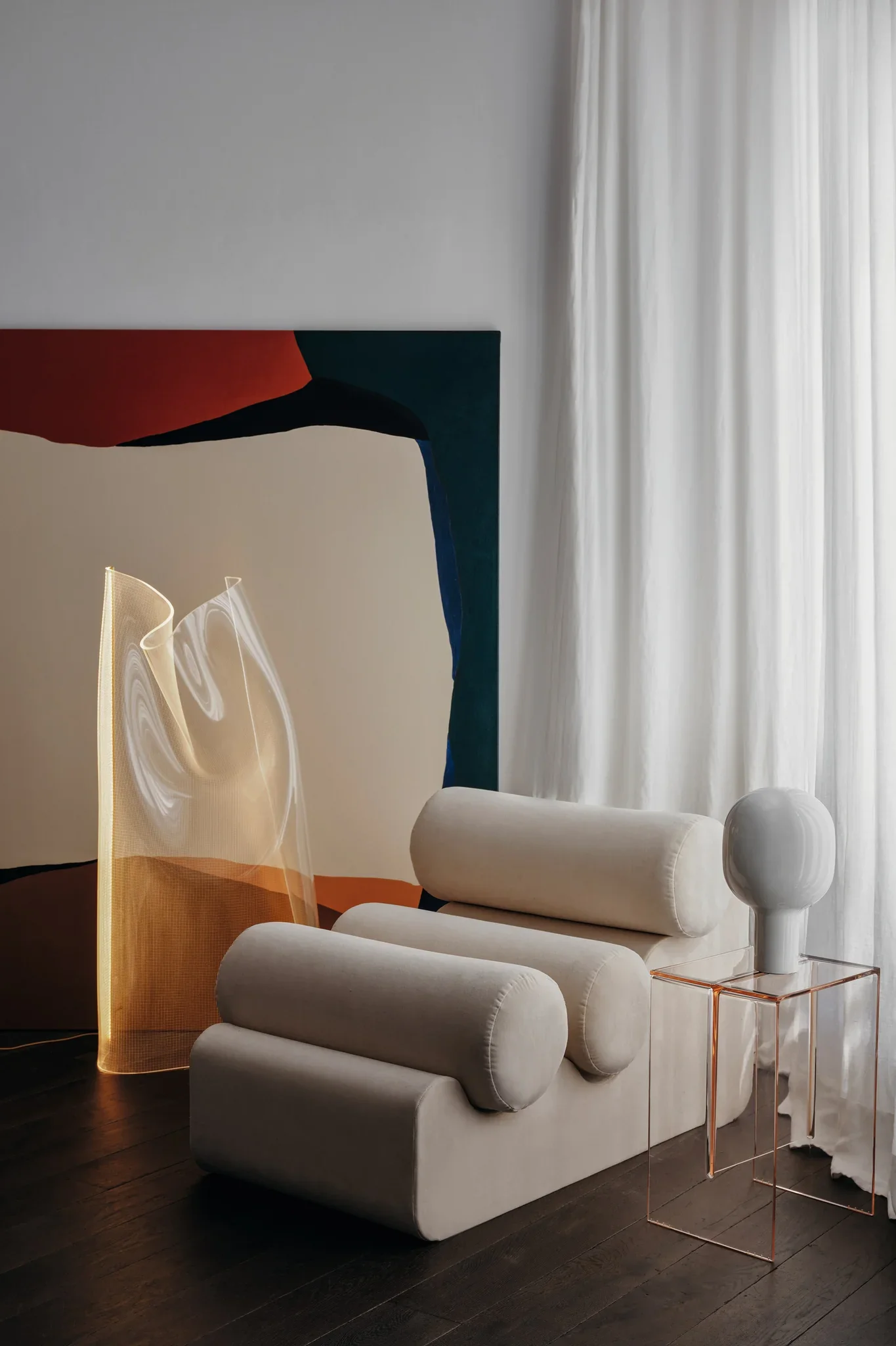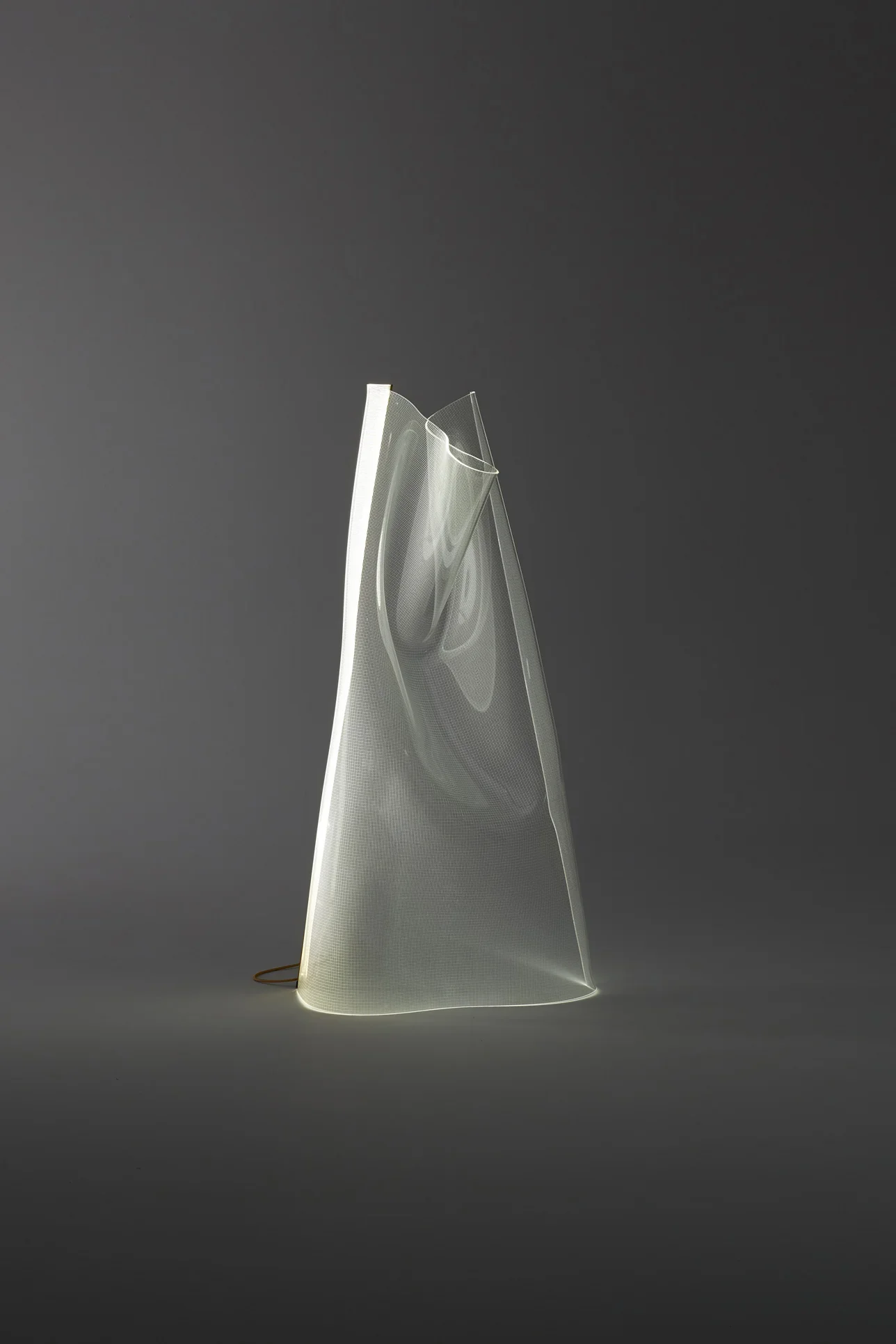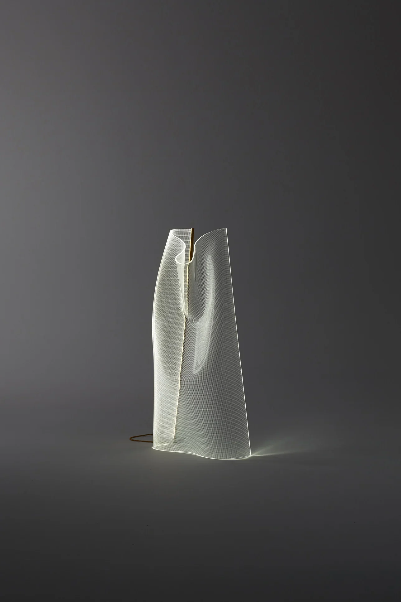 Designed by Partisans, the Gweilo Han floor lamp collection draws inspiration from traditional Chinese lanterns reinterpreted through contemporary minimalism. Each sculptural lamp features flowing, organic forms created through thermoforming optical-grade acrylic sheets while hot, resulting in ghostly, ethereal shapes that appear to twist and fold like fabric captured in motion. The extruded aluminum profile houses integrated LED strips that are elegantly concealed within the sculptural folds, creating a soft glow that accentuates the fluid forms. Available in two sizes with golden or silver anodised finishes, these floor lamps create dramatic sculptural statements while providing ambient illumination. Perfect for living rooms, bedrooms, and hospitality spaces, the Gweilo Han lamps bridge Eastern tradition with modern European craftsmanship. Each piece is hand-sculpted in Spain, making every lamp unique.