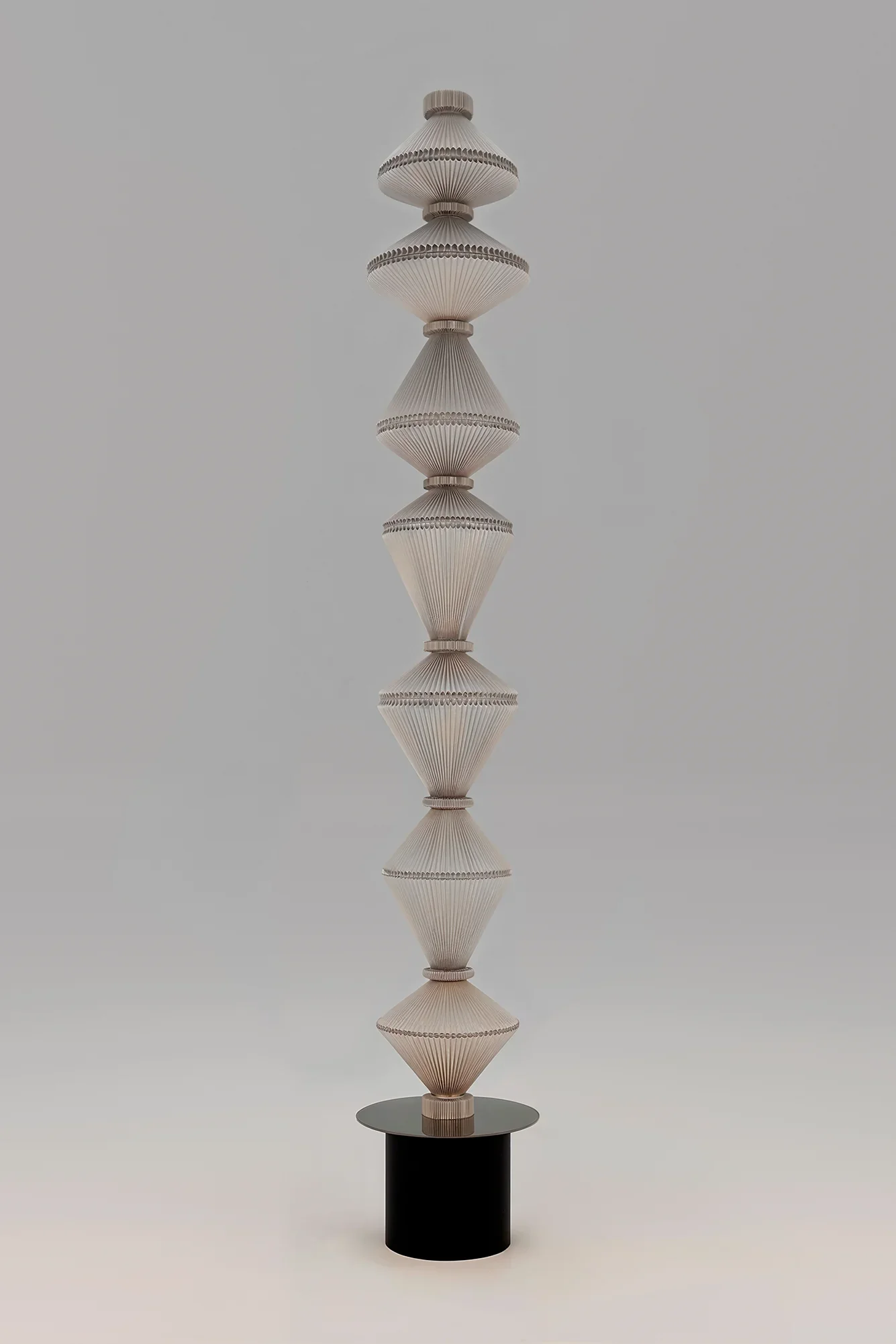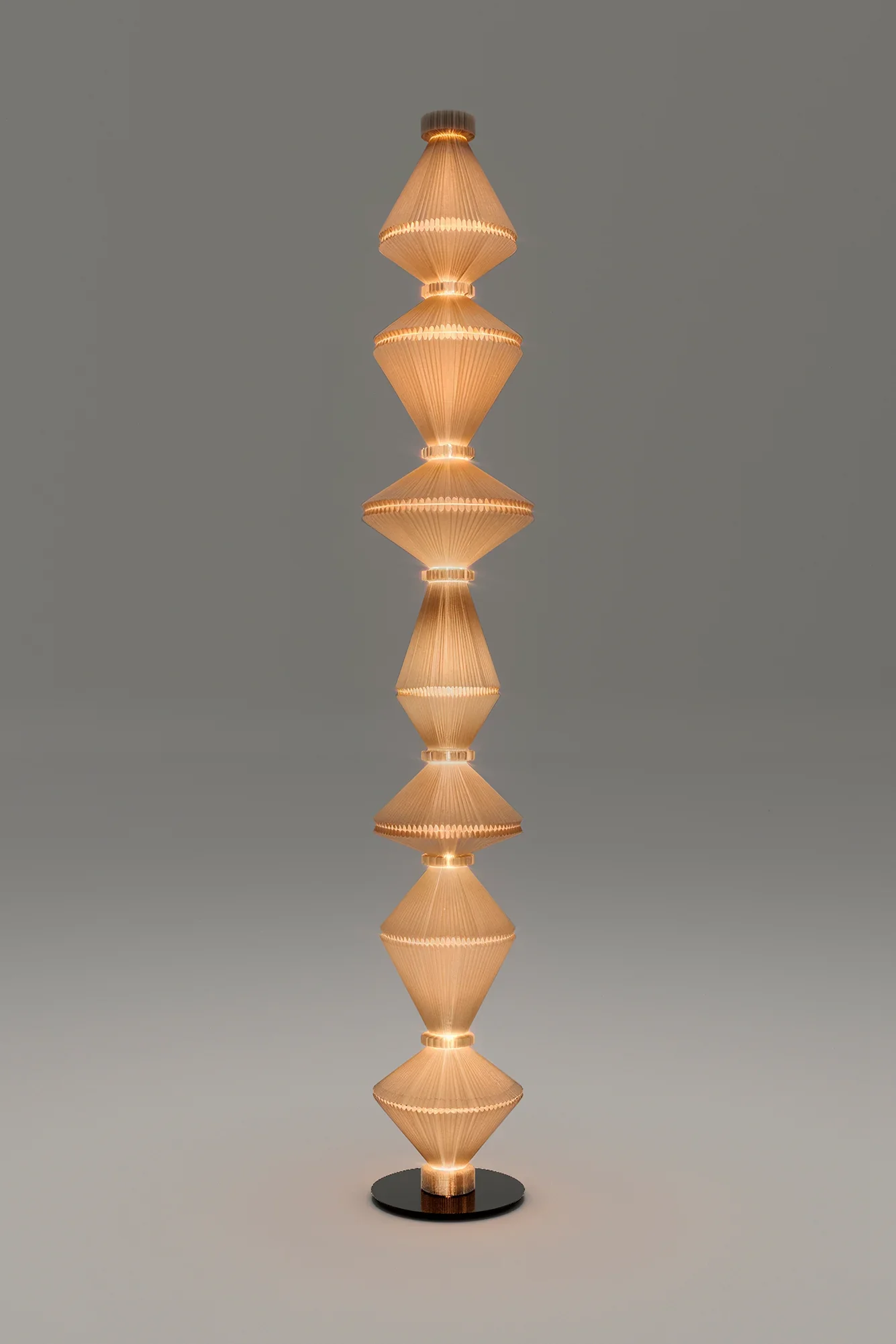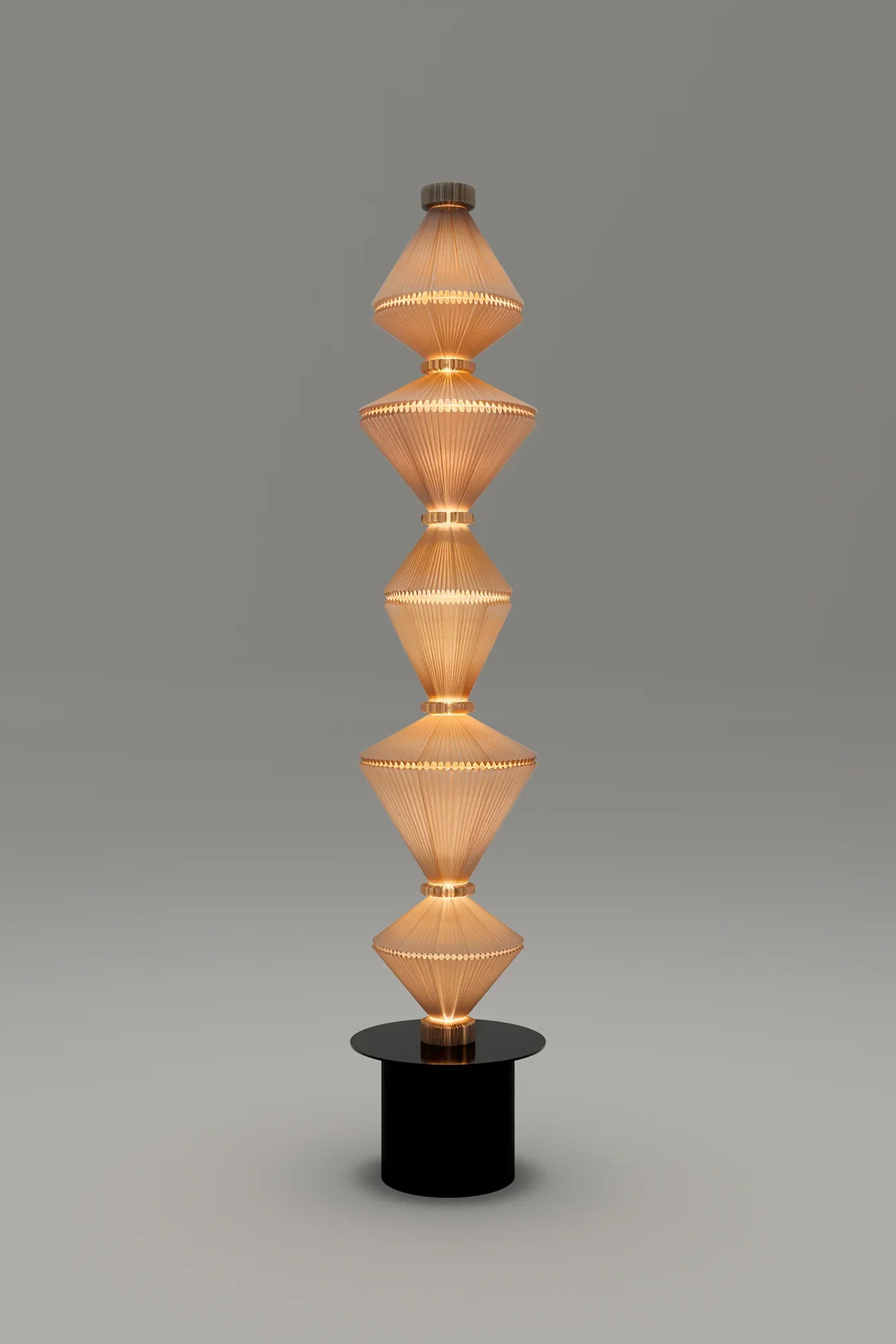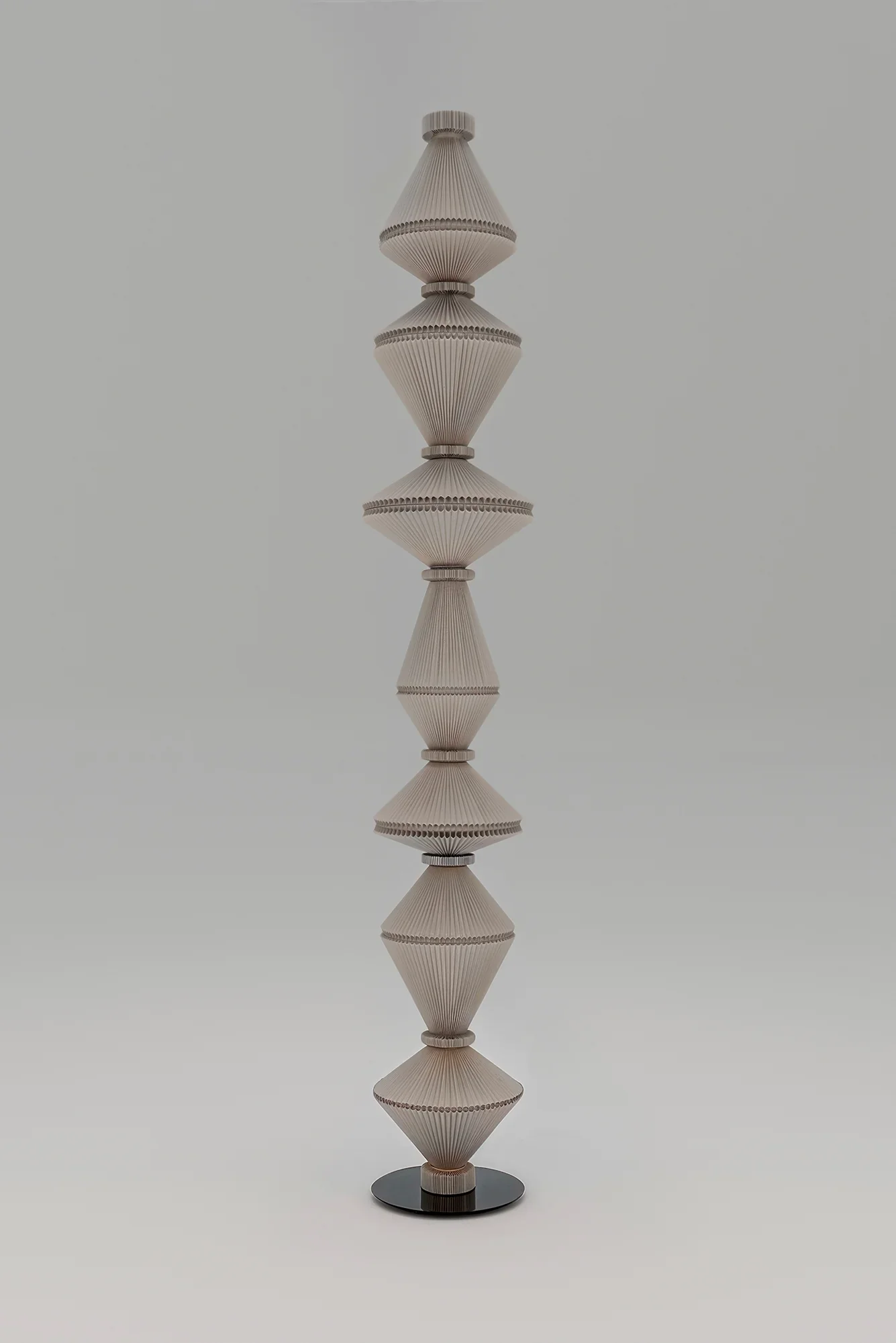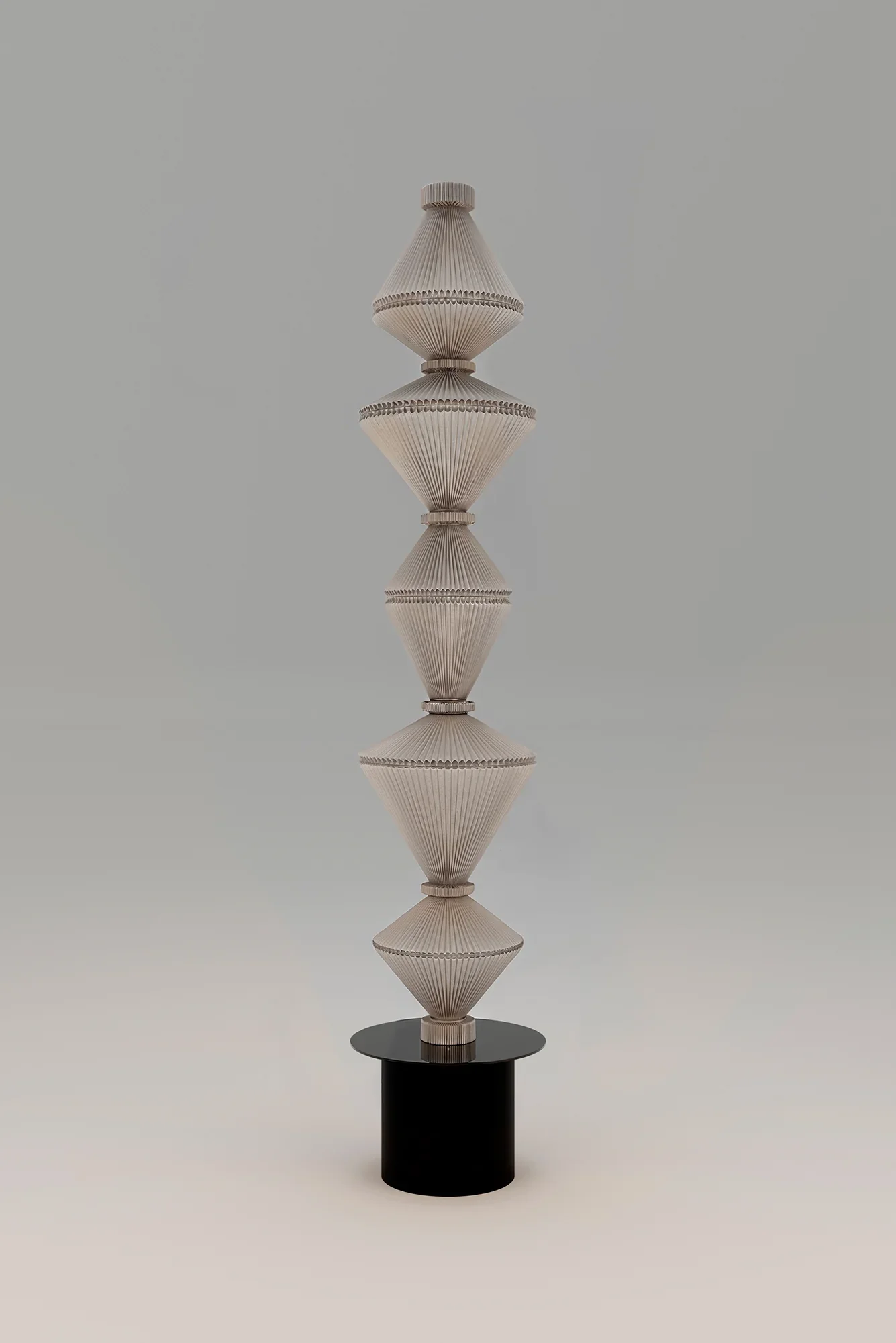 Designed by the Swiss trio Atelier Oï, the Oïphorique floor lamp collection embodies sculptural elegance through its distinctive totem-like silhouette. Each lamp features an elegant plissé textile diffuser anchored by a series of chrome rings that shape the fabric into a mesmerizing vertical form. The collection is available in two distinct versions: the standard P PE and P GR models feature a kinetic design where the textile diffuser moves and sways when illuminated, creating a hypnotic, living quality that diffuses light dynamically as if emitting luminous vibrations; the STILL versions (P PE STILL and P GR STILL) maintain the same elegant aesthetic with a fixed, stationary diffuser for those who prefer a more static sculptural presence. Available in two heights and five sophisticated colorways—snow mint, chocolate brown, apricot, pearl white, and light grey—these lamps function as sculptural furnishing accessories that command presence without overwhelming space. Handcrafted in Barcelona by skilled Spanish artisans, each Oïphorique exemplifies Parachilna's dedication to artisanal craftsmanship and the unique character that emerges when human hands shape luxury materials into functional art.