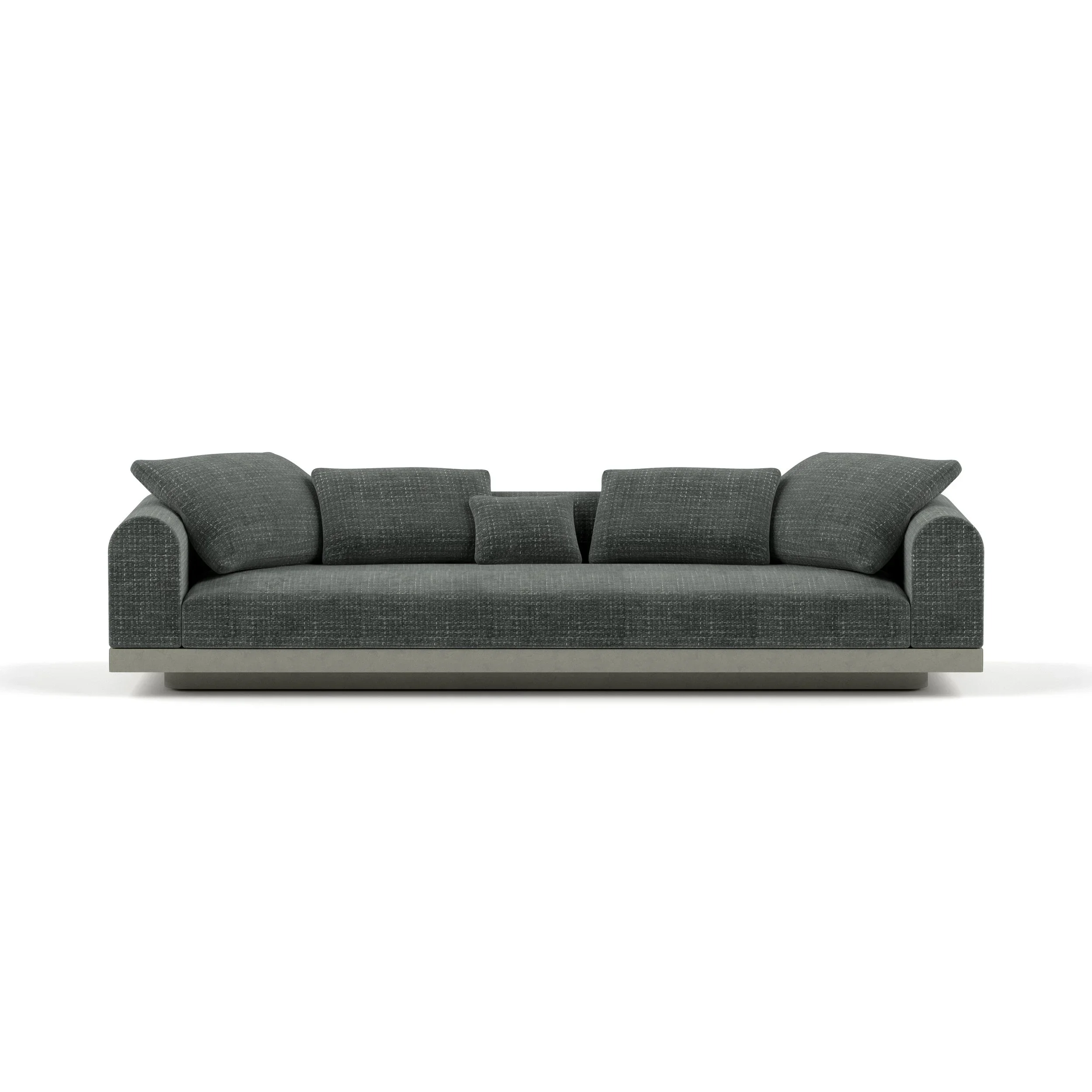Aqueduct Sofas feature two plinth base options for a more classical or modern feel. Some of the sofa configurations can also be acquired with an integrated stone or marble element placed alongside the backrest to serve as a side table. Fabric options for upholstery is a well-curated collection of fine fabrics from the industry's most esteemed manufacturers.