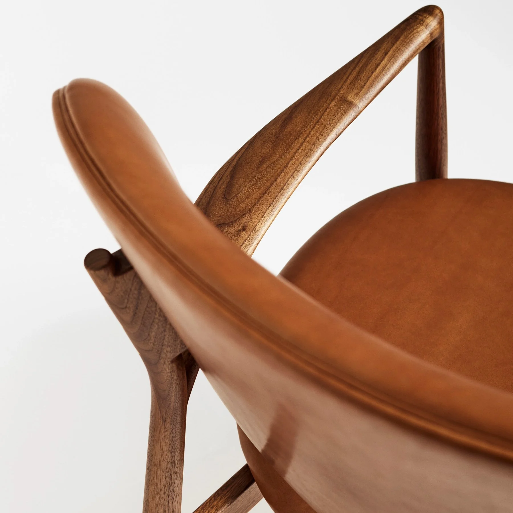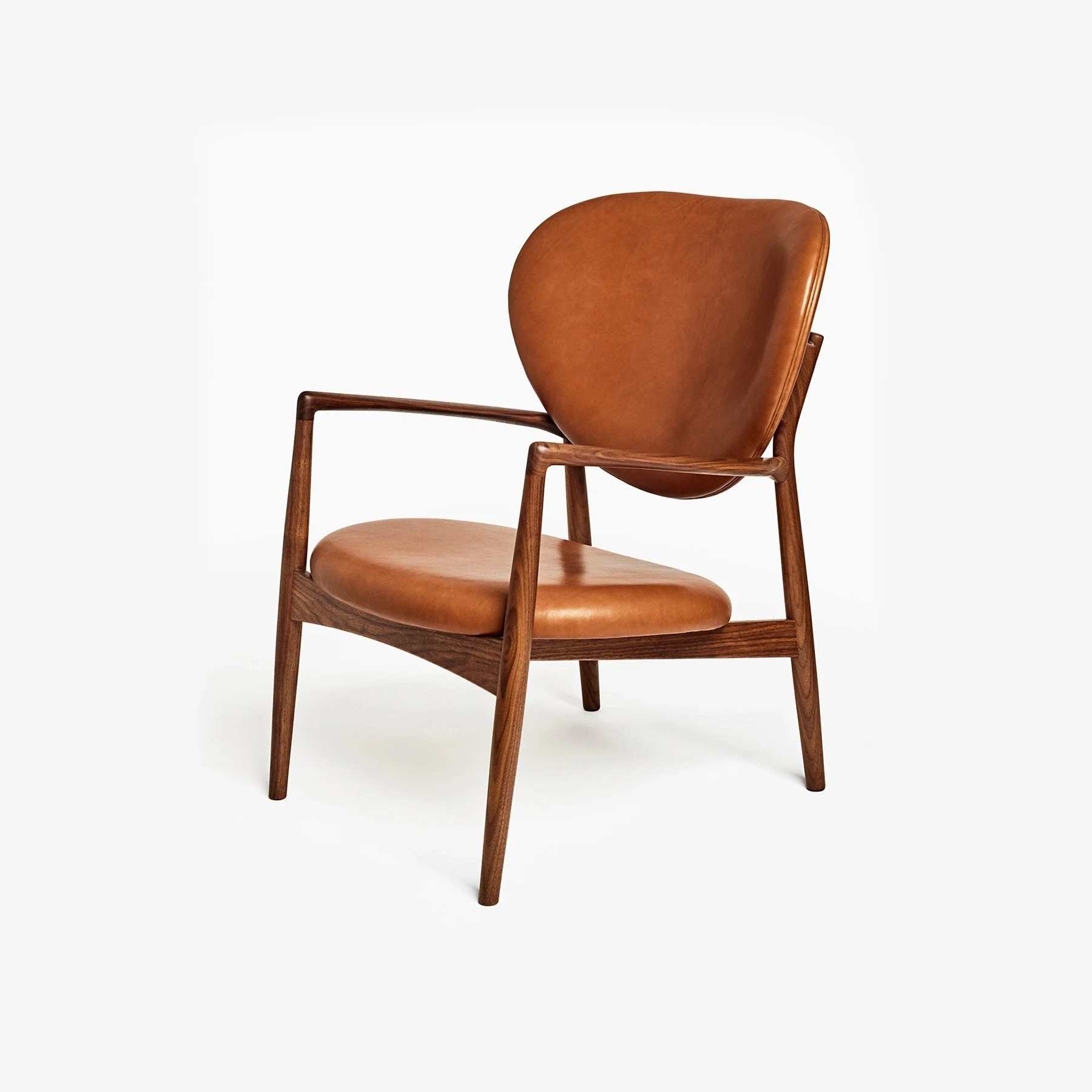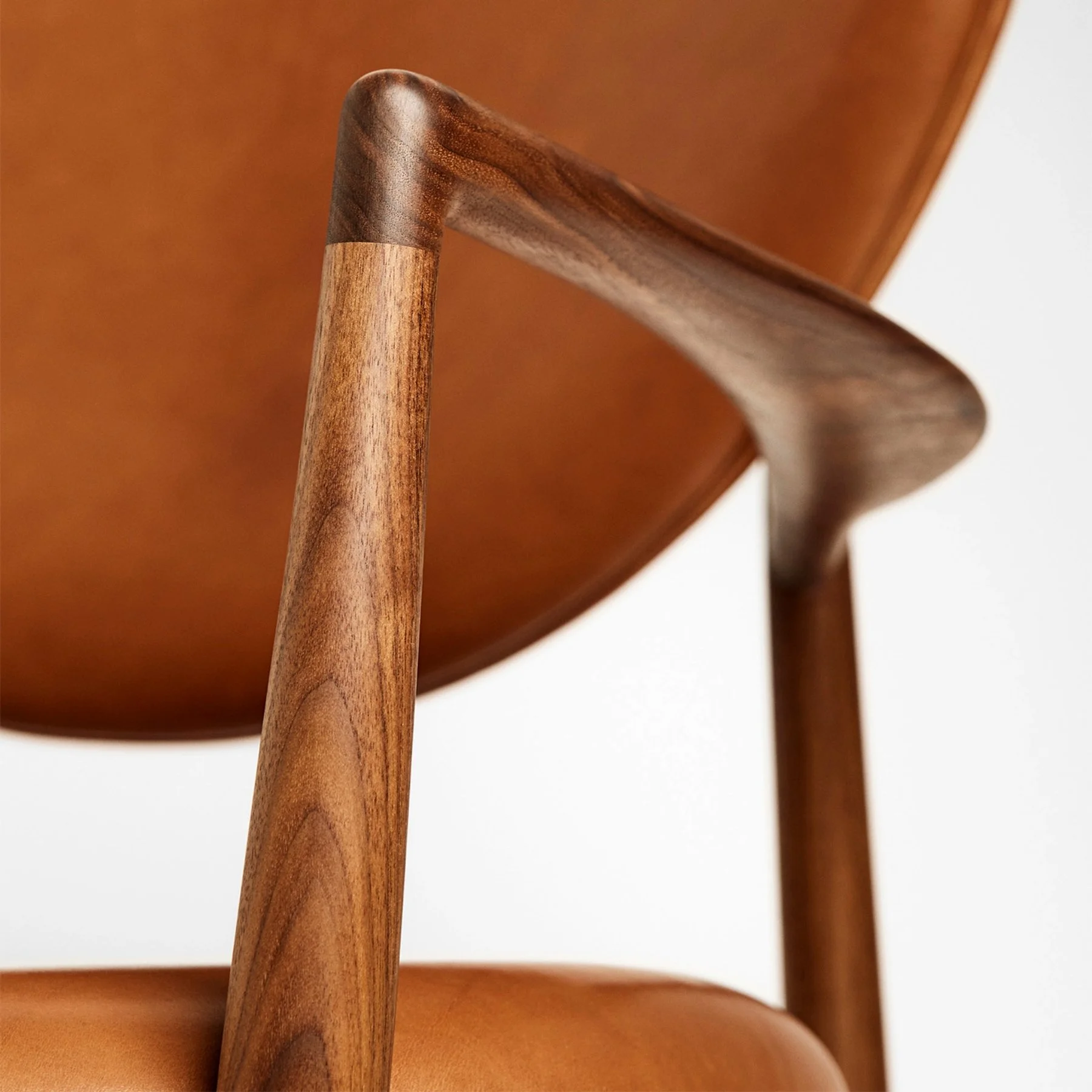 Designed by Danish architect duo Nils and Eva Koppel, the Model 190 chair was first produced in 1952 by Slagelse Møbelværk and marks the high point of the Koppel's brief but remarkable furniture design career. Now exclusively reissued by Dagmar as the Medallion Chair, this sculptural piece is distinguished by its blade-like arms and flowing organic curves. Available in Walnut or Oiled Oak, and upholstered in Cognac brown aniline leather.