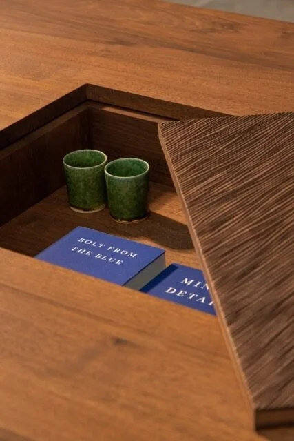 The tables are available in maple with black stain as well as in walnut and oak. They are suitable for dining, but also meeting environments. The storage compartment is there to place tableware and other things one needs to conveniently store in a place that is invisible and does not take any additional space in a home. Cabling can also be done through the storage compartment to make it useful for work environments.