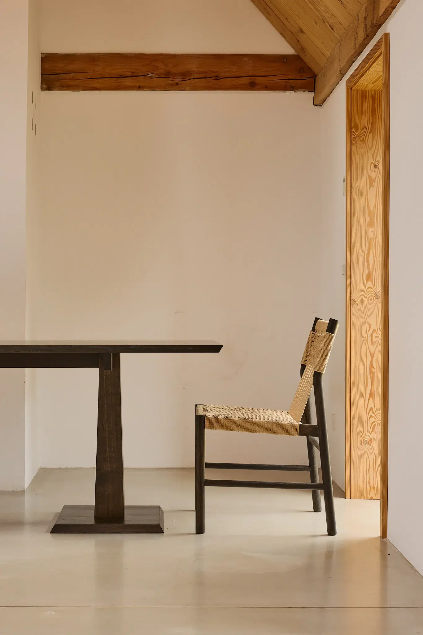 The MG215 Trapeza table represents the perfect marriage of contemporary Scandinavian design and traditional Danish craftsmanship. Created by the acclaimed Danish-Singaporean design duo Christian+Jade, this exceptional dining table was presented at Maison & Objet in Paris, where the designers were nominated for the prestigious 2024 Rising Talents Awards.