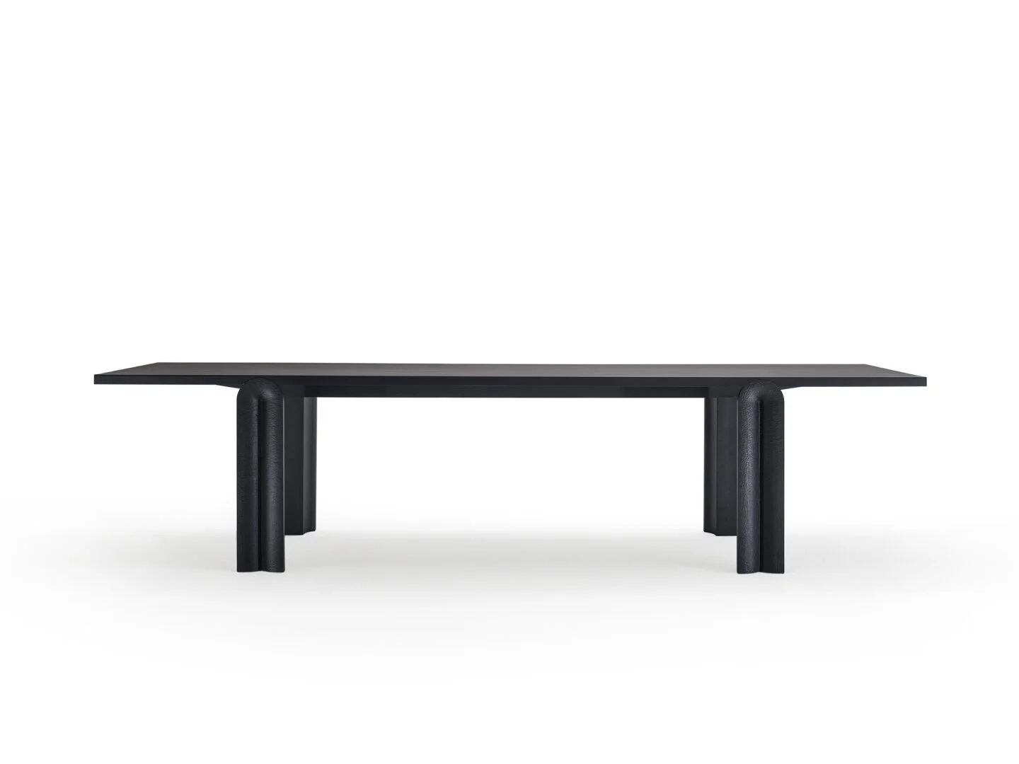 The Nave table brings a quiet architectural presence to the dining room. Its sculptural rounded legs — hand-carved with Zanat's signature surface texture on the front face — recall the calm rhythm of cathedral columns: grounded, balanced, and refined without effort. The carving accentuates the rounded volume of each leg, adding depth and tactility to a form that is already considered in its proportions. Crafted entirely from solid European hardwood in three generous lengths, the table is available in maple black, oak, and walnut, with a choice of Tiny Touch or Grooves carving. Like the nave of a great hall, it becomes the organizing element of the room — the place everything else gathers around.