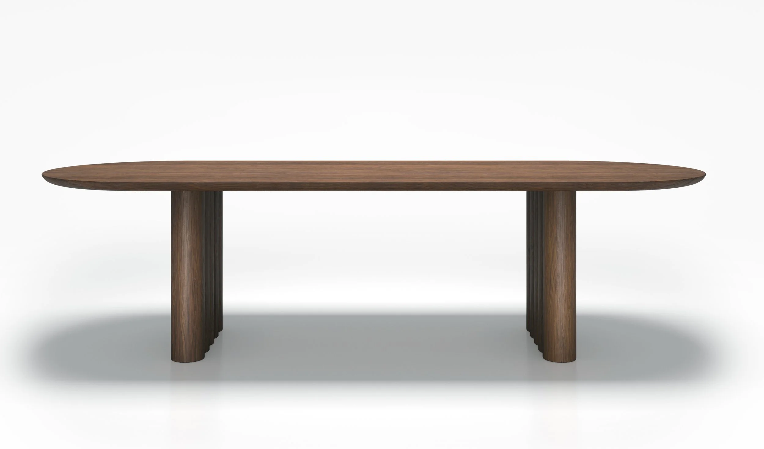 The veneer covered table legs are available in both 5” (tabletop thickness 1.2”) and 6” (tabletop thickness 1.6”). Throughout the entire design process, the focus has been on creating a fine line between the imposing legs and the perfectly balanced curved shapes that define the solid wood tabletop.